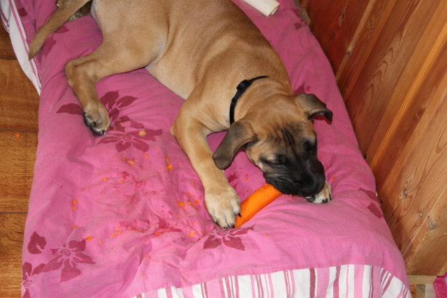 …så først på var det om å gjøre å få av mest mulig biter. Kan trygt si at det var gulrot over det hele etter en stund. Men gulrot er ikke skadelig for hunder, og fikk brukt litt tid og energi på det.