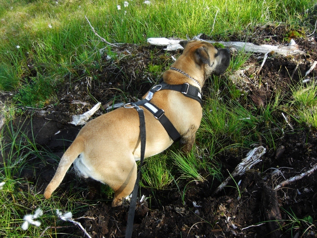 Vi klarte å finne alle myrhullene som var der tror jeg, og er det vann så er Amanda glad! Hun har helt sikkert hørt at gjørmebad skal være bra, for hun la reg rett og slett ned. Det fikk jeg ikke bilde av, siden jeg var opptatt med å passe på at jeg ikke fikk noe gjørmebad.