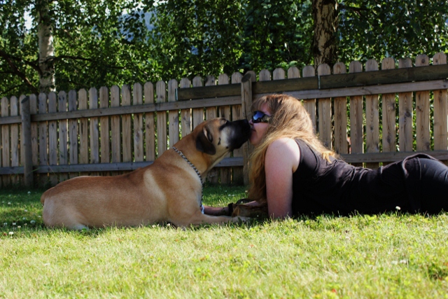 Er det ikke plass når hun kommer, ja da ordner hun seg bare plass, ikke noe problem…Siden jeg alltid har ønsket meg en søt liten kosehund så var valg av rase enkelt, det måtte bare bli en Boerboel, de tar minimalt med plass, tror de selv! Amanda elsker å sitte på fanget, for ikke å snakke om hvordan det er å få en BB fot på tærne, uæ!