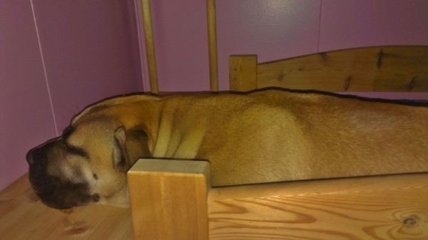 Var ute å luftet Amanda, og tenkte det hadde gått så bra så lenge, og at det hadde vært noen veldig rolige dager her (det er det dummeste en kan tenke….) Så begynte Amanda å tulle med båndet, hoppe opp å bite i det, surre det rundt føttene sine osv, og ingen respons på hva jeg sa og gjorde, det var bare å tulle videre. Resultatet av det hele var at jeg ble så drittlei hele hunden at jeg la meg oppå henne, hun ga seg ikke da heller, til å begynne med, for vi hadde det da så morsomt! Noen av oss hadde det kanskje morsomt, jeg var ikke noen. Jeg holdt henne fast til hun roet seg, så ruslet vi noen runder rundt i hagen, huset osv for å roe ned det hele og få en litt «bra» avslutning begge to.