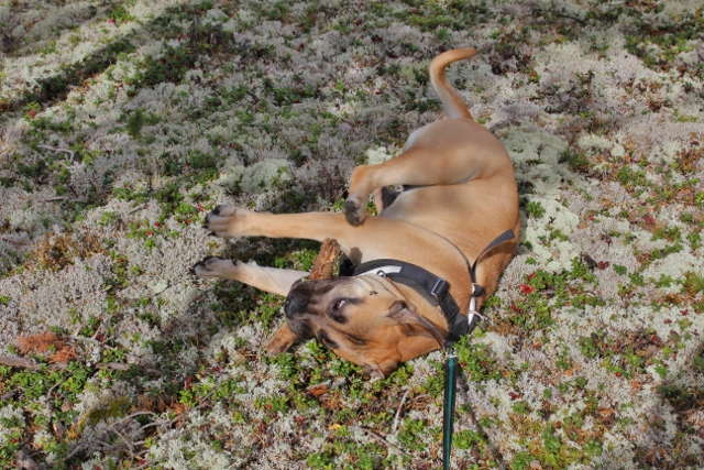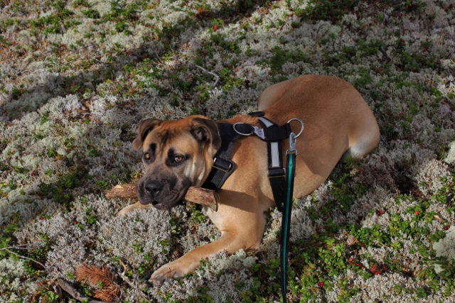 Så etter litt kom vi ned på en annen vei (er helt utrolig mange forskjellige veier oppi skogen her, opp og ned, kryss og tvers osv) denne veien kjører det biler på en og annen gang, så jeg stoppet noen sekunder for å se om det kom noen, da la Amanda seg. Hun la seg rett ned i sanden (kvabb lignende) og der så det ut til at hun hadde tenkt å være. Ikke tale om at hun skulle reise seg igjen. Jeg prøvde å dra i forskjellige retninger, men hun lå. Jeg tok tak i selen for å lette henne opp, men da rullet hun seg over på ryggen, og lå å sprellet. Så da sto (lå) vi der da, og håpet at ingen skulle finne på å komme.