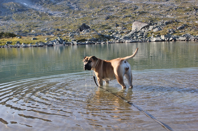 Er man ute i nærheten av vann er det veldig bra å la hunden vasse, helst opp til buken for at den får avkjølt seg.