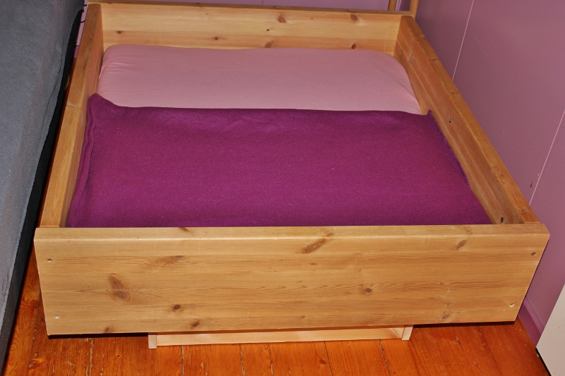 Jeg er ihvertfall veldig tilfreds med ny hjemmelaget hundeseng til Amanda, den måler forresten 100×90 cm innvendig.