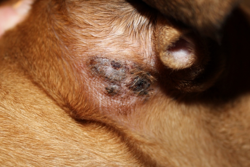 Man ser området som var/er sår på bildet, de små mørke flekkene er størknet blod, jeg studerte de veldig mye.. Jeg var inne på tanken om lus eller andre parasitter, så jeg fulgte veldig godt med. Har aldri vært borti lus eller lignende på hund noen gang, så er ikke sikker på hvordan det er, men vet at lus er noe som kan smitte veldig lett, og er noe som er «vanlig» på hund.Men nå var jeg «heldig» siden jeg nærmest så at Amanda fikk så stort sår. Men så var det hvorfor hun klødde i utgangspunktet? Jeg tror det bare var et uhell, som ble større.