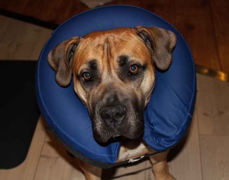 Oppdatering om annen krage/skjerm her: https://boerboelheidi.com/2014/09/01/comfy-cone/