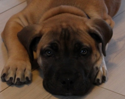 Amanda ser ut til å takle barn hun blir kjent med bra, nesten for bra. Hun flater ut midt på stuegulvet her og sover, selv om barnebarnet er rundt omkring. Men hun er jo samtidig så «voldsom» pga tyngden sin i forhold til små barn, om hun står ved siden av en liten unge og snur seg.. eller blir glad og logrer..