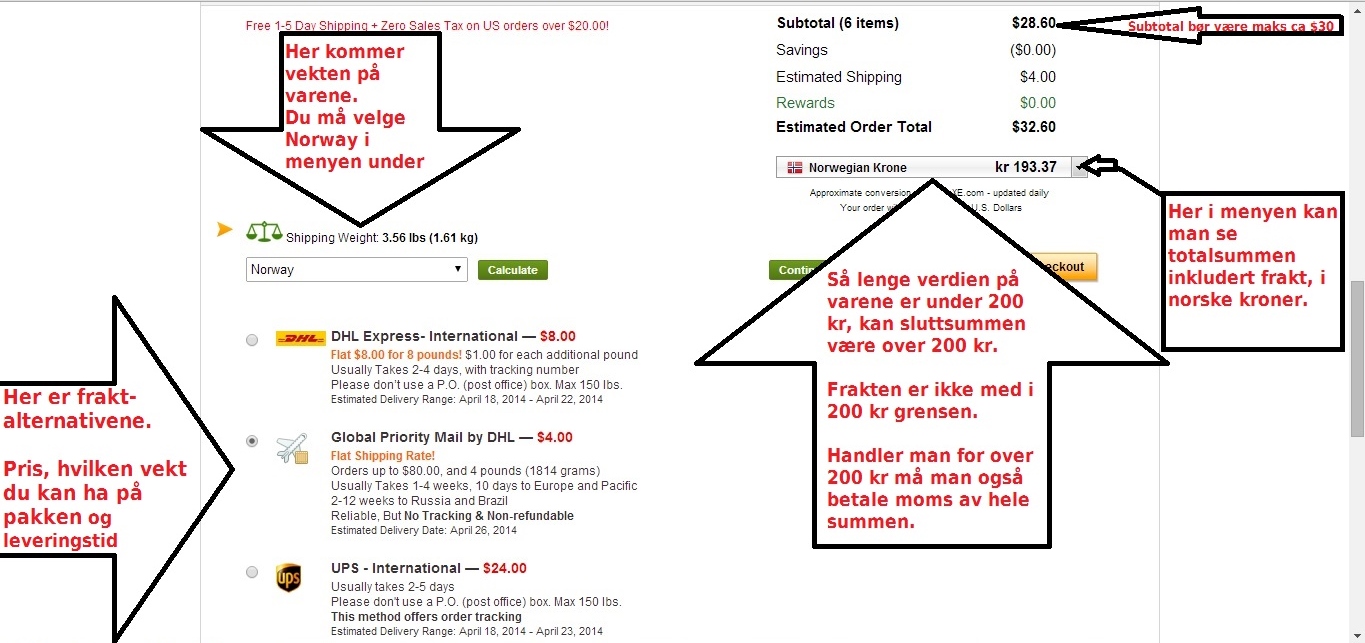 Velger man det nest dyreste fraktalternativet er det på $8 og da kan man ha en vekt på ca 3,6 kg (8 pound) og det koster $1 ekstra for hvert pound over, men verdien kan uansett ikke være over 200 kr om man vil være sikker på å ikke betale moms og gebyr.