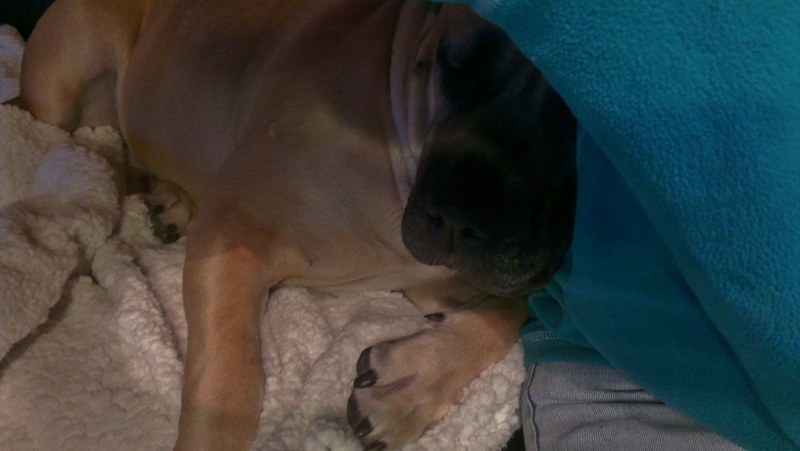 Her ligger hun å sover inntil ryggen min, det var forbausende tungt.