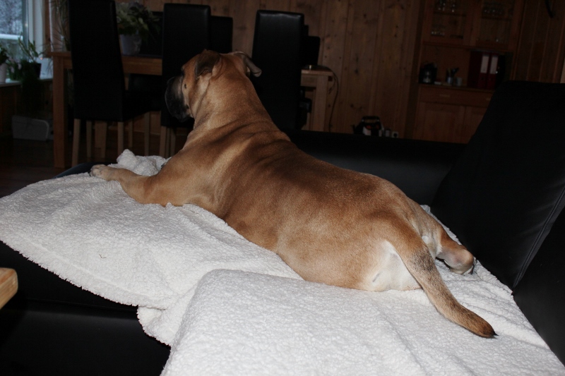 Amanda tronet på sofaen i morges, jeg hadde hatt ut Kaos, og da måtte hun prøve å følge litt med..