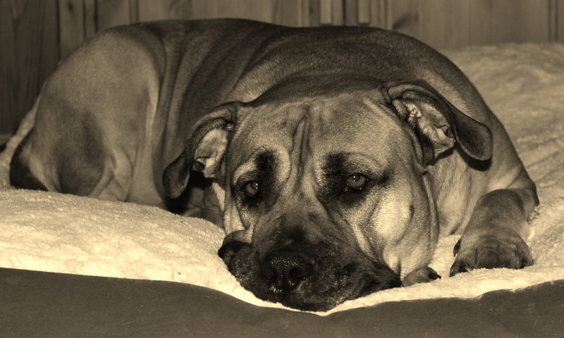 Boerboel og mange andre raser som er litt tunge og har kort pels får ofte liggesår, eller hva det heter. Albuene og hasene (?) er de punktene som er mest utsatt, og får ofte tykk og noen ganger sår hud. Hva man kan gjøre med det vet jeg ikke, annet en å passe på at hunden har riktig/mykt liggeunderlag, og følge med så det ikke blir sår/betennelser.