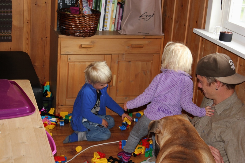 Jeg tok en rask runde oppi skogen i dag når vi gikk ut, så hun skulle få ut litt energi før alle var ute i hagen. Det fungerte helt greit, helt til jeg kastet ballen hennes rett forbi ene barnebarnet.. og plutselig så lå det et barnebarn rett ut på plen. Amanda kan ikke beskyldes for å være særlig hensynsfull, ikke mormoren heller.. Men barnebarn er heldigvis robuste og tåler en del 🙂