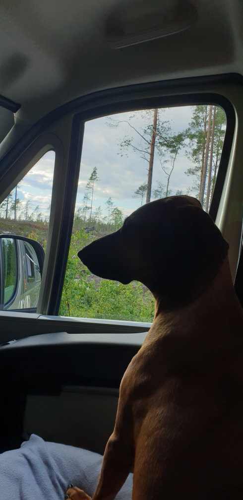 Andre kvelden var vi plutselig et helt annet sted enn planlagt, og vi bare fant en plass å parkere på, som så grei ut. Var et godt stykke inn i skogen, men det er jo greit.. Var en del bråk fra fugler der, og Jen var til tider litt slitsom.. Tore var ute av bilen en tur, og jeg og Jen satt inne i bilen med åpne vinduer (myggnetting). Jen murret og var veldig intens noen ganger, og jeg hysjet på henne. Vi hadde parkert slik at man ikke så bakover, bare foran og til siden. Om man ikke satt som Jen, som satt i passasjersetet foran, og blant annet så i speilet.. Tore kom inn igjen, og kunne fortelle at han skremte bort en flokk villsvin 😲 Jeg rakk akkurat å se noen få løpe over en bakketopp i skogen. Og i den skogen hadde vi gått å cachet i flere timer om dagen, både med og uten Jen 😲 Vi visste jo at det var villsvin i området, men ikke så nært! Og ikke så stor en flokk! Det var 30-40 dyr totalt.
