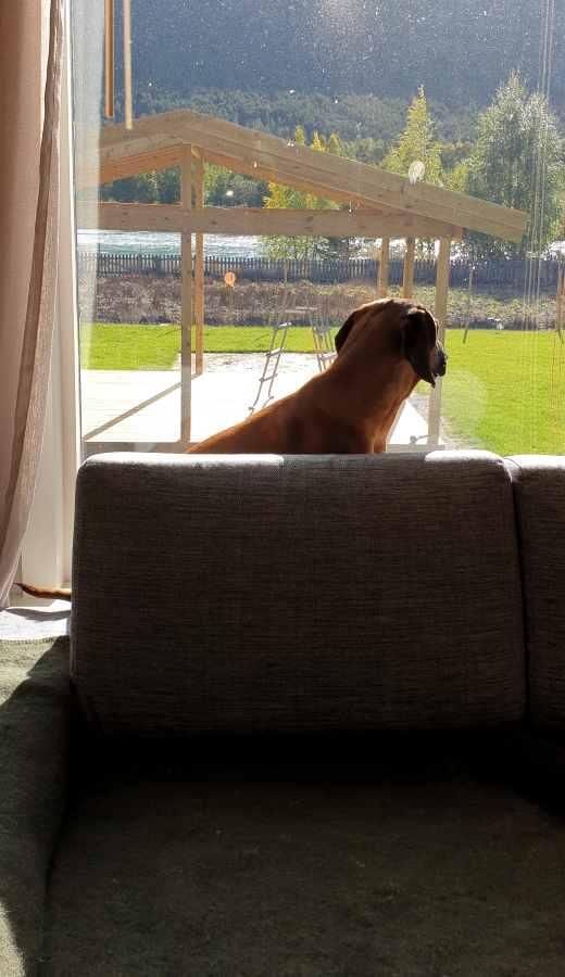 Hun liker ikke å være alene, ikke engang 20 sekunder. Vi har ikke gått inn for å trene noe på det heller. Ser at hun overhode ikke er klar for det enda. Men plutselig så snur det, og det går an å trene litt på det.