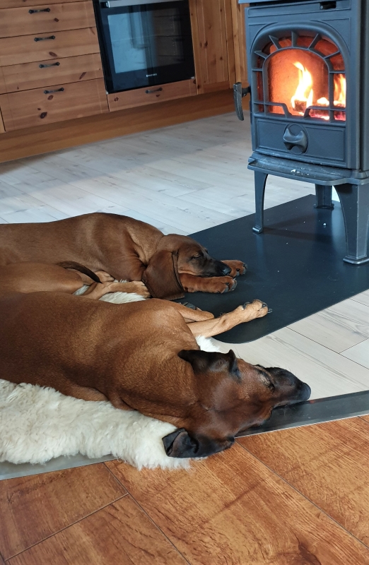 Vi har begynt fyringssesongen for fullt. Har vært -7 et par morgener når vi har stått opp. Og da er det kaldt om kvelden også. Ser ut som om begge hundene liker seg foran ovn 😄