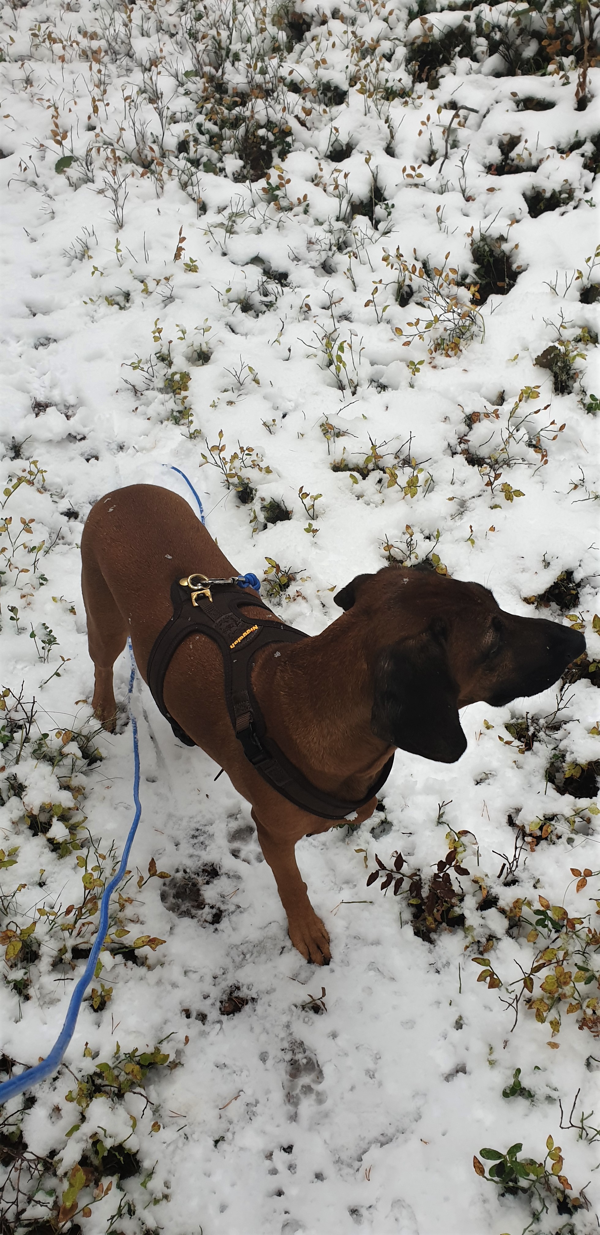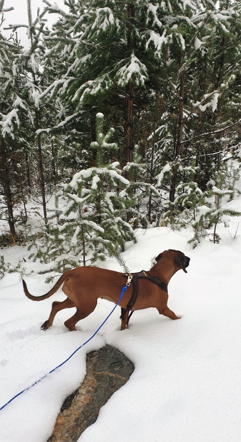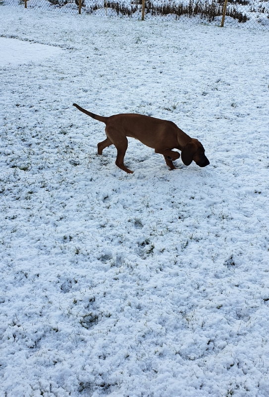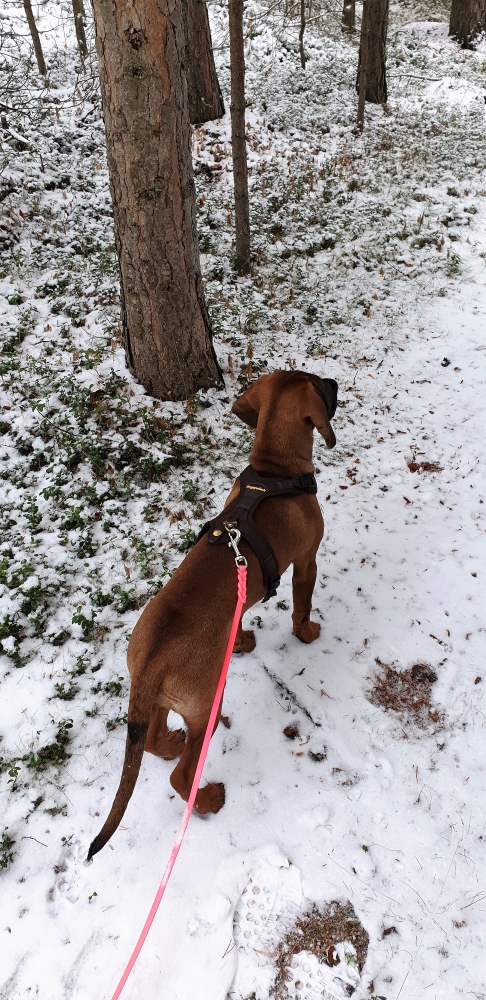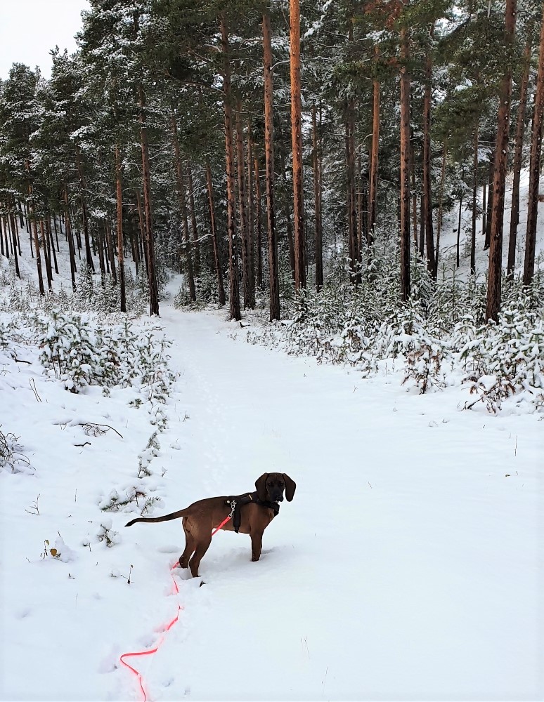 Denne uken har jeg og Skye begynt å gå tur 😀 Altså skikkelig tur, ikke sånn valpeopplegg. Plutselig var det som det gikk opp for Skye at det gikk an å gå.. Vi bruker god tid, stopper å lukter på alt mulig, vil si vi stopper begge, men bare en som lukter 😊 Vi har ikke som mål å gå lengst mulig på den tiden vi er ute, det har vi ikke med Jen heller. Men er tiden og hva de opplever den tiden vi er ute som er viktig. Og for Skye er det mye spennende og morsomt rundt omkring. I går var det kommet en del mer snø, og da så vi alle dyresporene veldig godt. Morsomt å se henne «jobbe» med forskjellige spor.