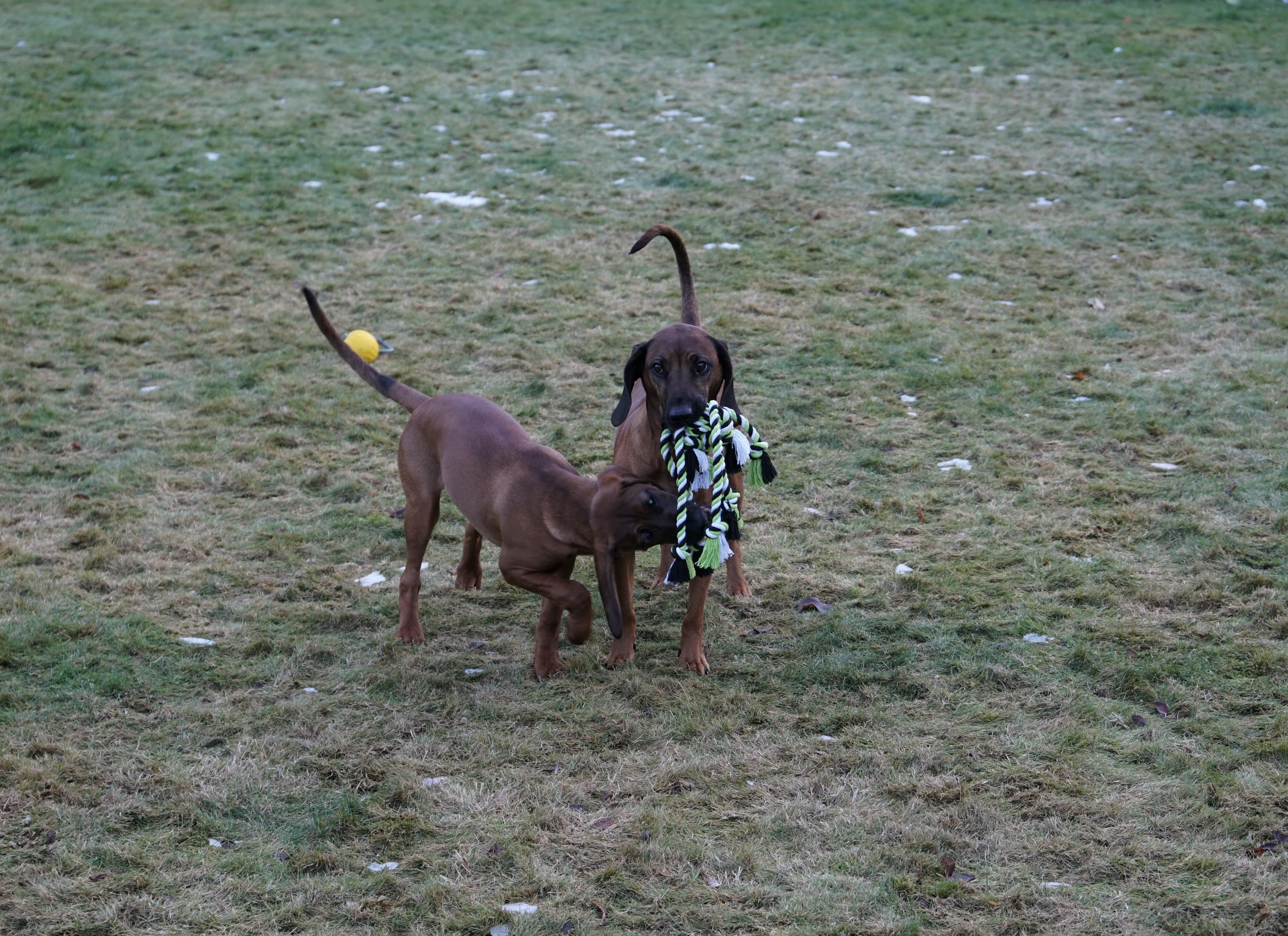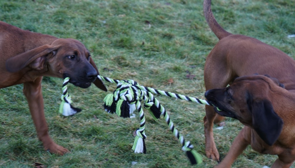 Skye hadde fått en liten tur med Tore i dag, og i kveld ble det ikke noen tur på noen av de. De fikk en runde i hagen, men tauet.. Denne tauknuten er utrolig fin å leke med.