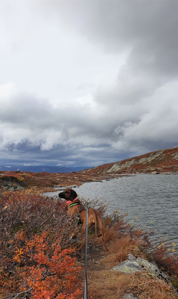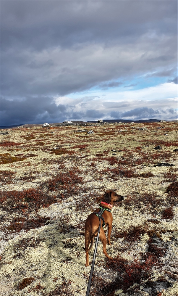 Jeg gleder meg så til vi kan ta med begge hundene på slike turer. Nå må en av oss være sammen med Skye, og man blir utrolig bundet av det. Vi gikk nok litt mer med Jen på den alderen, tror jeg. Men hun gikk litt annerledes. Men Tore og Skye kom å møtte oss når vi begynte å nærme oss veien igjen, så det blir litt tur på Skye også.