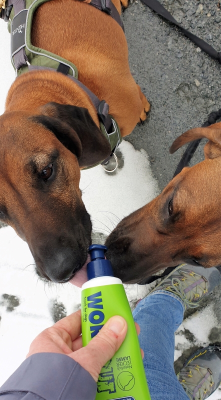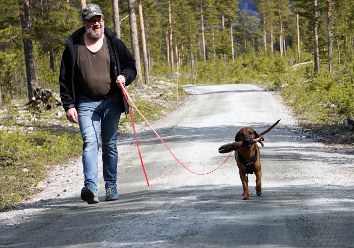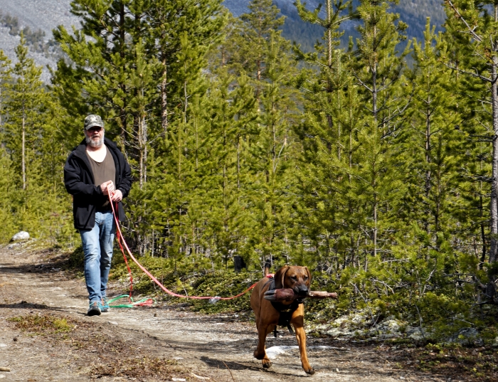 I går dro vi rett på tur når jeg kom hjem fra jobb. Var kjempeflott vær, så måtte bare benytte anledningen. Jeg benyttet også anledningen til å gå med begge hundene alene igjen. Husket på å ta med svivelen, og det ble en utrolig stor forskjell. Måtte lage til en liten vri, siden kobbelene vi har ikke har krok i begge endene. Vet ikke om det finnes med litt lenger kobbel, men greit å ha slike vi har synes jeg. Se på videoen lenger nede hvordan festet til magebeltet er. Jeg synes det er veldig greit med magebelte når jeg går med en hund også. Blir en ekstra sikkerhet, og kan likevel styre og holde i koblene med hendene når jeg må det.
