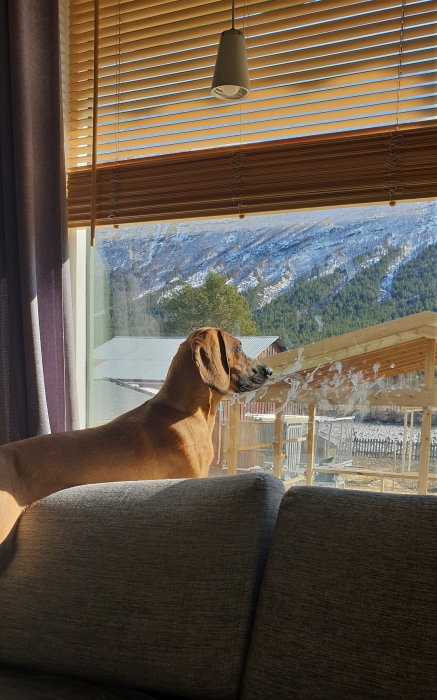 Hundene har vært med både ute og inne. Er de inne så liker de å følge med, spesielt ei av de