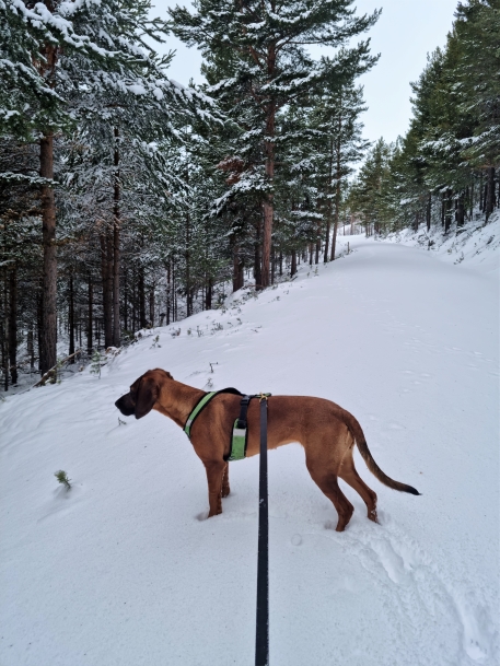 Jeg hadde bestemt meg for å gå en tur med Skye lørdag. Hadde kommet en del snø, og ingen hadde gått der etter snøfallet før vi gikk (ja bortsett fra en del dyr). Det er noe eget å være de første som går på slike «hvite tepper» 🤩