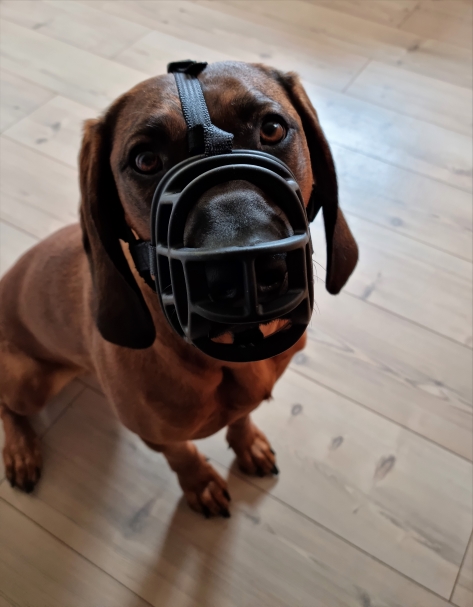 Jeg kjøpte første munnkurv til hund for mange år siden, til Amanda. Det var bare for å ha den «i tilfelle». Hun brukte den aldri annet enn når vi trente på å bruke den, og det tok jo en stund.