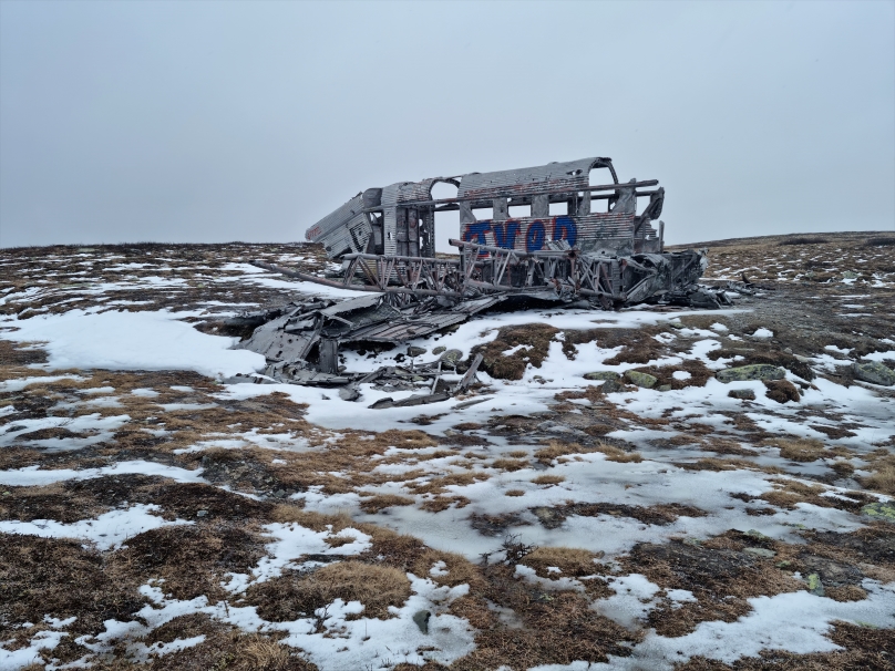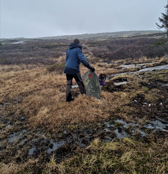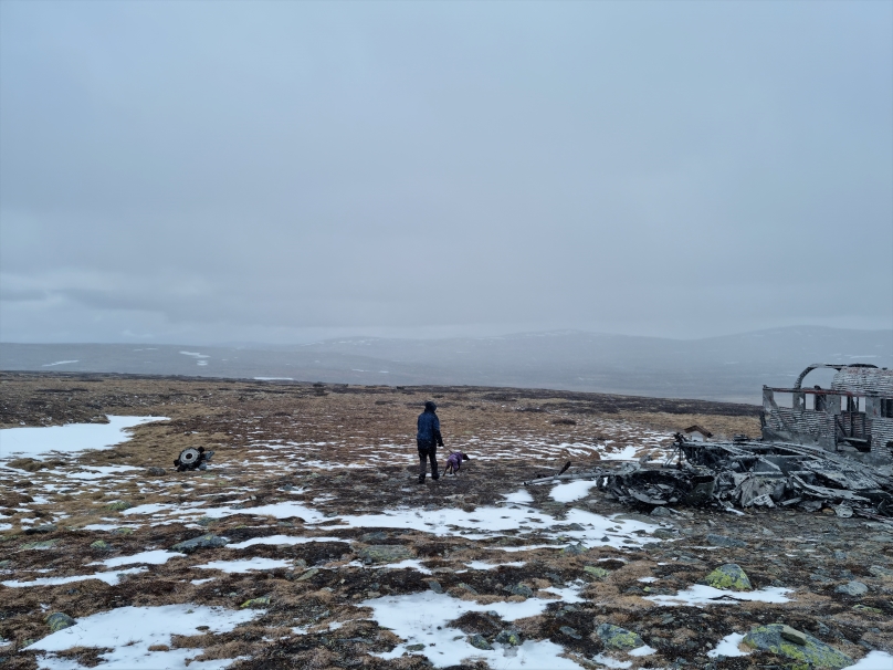 I fjor høst fikk jeg tips om en cache inne på Ringebufjellet. Vi fikk ikke tid til å gå inn der før snøen og vinteren kom. Nå fikk vi plutselig en god idé, at vi skulle gå den søndag. Vi kjørte nedover, og når vi parkerte fra der vi skulle gå så snødde det.. Vi fant ut at vi fikk bare la være og vente til senere, heller finne på noe annet. Tore var ute for å finne cachen der vi parkerte, og når han kom inn i bilen igjen så sa han at det begynte å klarne opp bortenfor oss. Ti minutter senere var vi på tur innover fjellet 😁 Når vi kom bort til der vi skulle krysse elva ble vi litt overrasket, brua lå fremdeles på land. Ikke var det slik at man kunne legge den ut selv heller. Var så høyt ned til vannet der brua skulle ligge, og alt for dypt, så var ikke mulighet for å gå der. Å snu var ikke noe alternativ, så da var det å finne to steder man kunne gå over elva. Heldigvis hadde vi bra høye turstøvler, så vi kom oss tørrskodd over. Vi hadde veldig fint turvær innover, men tok jeg bilde da? Neida. Når vi kom bort til flyvraket så gikk vi litt lenger for å finne cachen, og da tok jeg bilder. Og da begynte det å hagle, og det blåste 😆 Vi visste det kom til å bli litt ruskete vær, og hadde heldigvis tatt med et dekken til Skye også. Det fikk hun god bruk for på hjemturen.