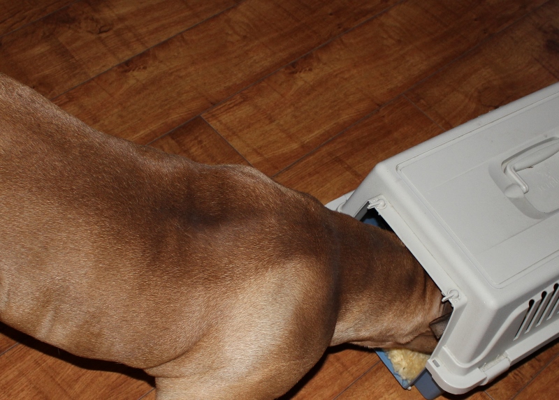 Duke er snart klar for å reise hjem, legg merke til at han har saueskinn i bunnen av buret, ikke bare Amanda som er «bortskjemt» nei 😀