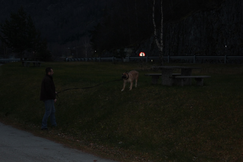 Shep (en annen hund vi hadde) sa heller aldri noe når han tok etter katter og rev ute her. En gang satt det en rev inntil døren her han kom ut, da holdt han på å løpe ned grinden, siden reven smatt mellom der. En annen gang satt det rev nede ved trappen, og begge forsvant nedenom huset, Shep kom heldigvis tilbake.