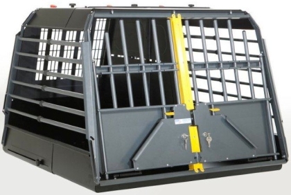 «Vario Cage dobbeltbur med deformasjonssone og justerbar skillevegg Har du to hunder i bilen skal de sitte atskilt uten å kunne nå hverandre. Behøver en av hundene mer plass kan skilleveggen justeres i sideretningen. Har du en stor hund, eller bare en hund som skal med, kan skilleveggen demonteres. Med noen enkle håndgrep ”skreddersys” buret til akkurat din bil!