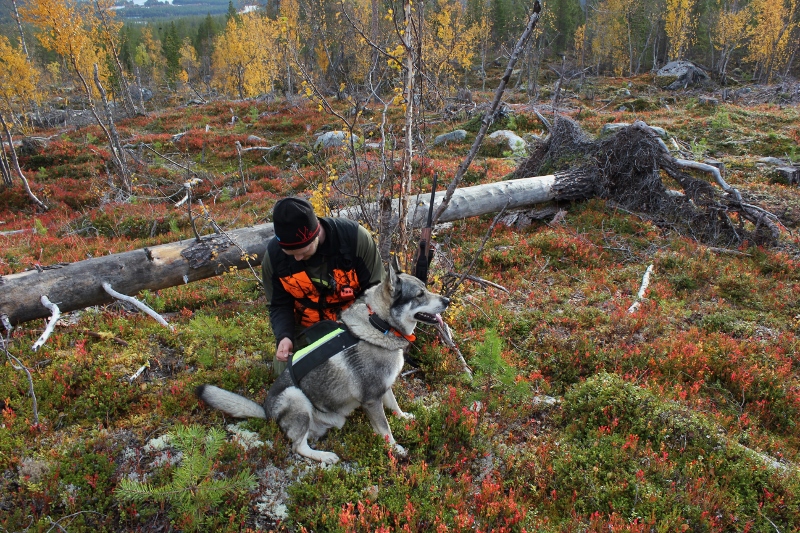 Vi gikk opp til området der det var, Jen vimset litt hit og dit, det hadde vært flere hjort der samtidig. Men så synte jegeren fram hvor han sto, og tydelig blod. Da Jen luktet det, så kom hun i et helt annet modus, og sporet helt fantastisk! Hun var bittelitt forsiktig når hun oppdaget hjorten, ikke så rart, det har vært bare en fot i enden av sporet tidligere, og nå lå det et helt dyr i enden av sporet. Men så gikk hun over til litt mer interessert