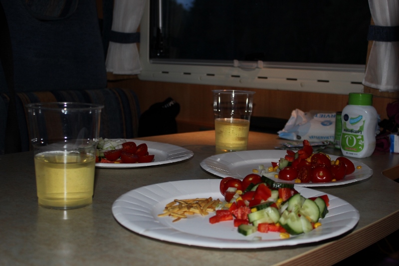 Vi spiste middag om kvelden, ble lettvint, laget til salat for begge kveldene før vi dro, la bare salat og grønnsaker lagvis i en boks. Fredagen hadde vi kylling til.