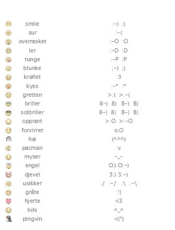Det er noen smileys (smilies) som en kan bruke direkte i wordpress blogger, som jeg vet om, så tenkte jeg skulle skrive de ned her. Men så ble det så mye om og men for å skrive de ned… Så da kopierte jeg et bilde fra her