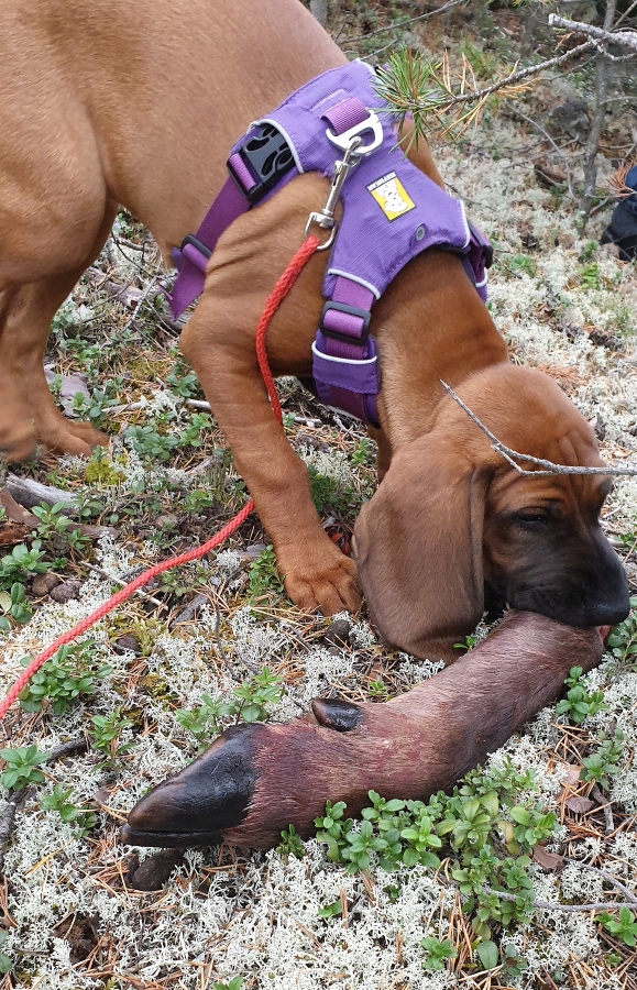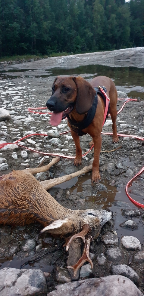 Skye ble godkjent ettersøkshund i fjor, med tre forskjellige førere. Og hun fikk sitt første skarpe ettersøk. Etter det ble det flere søk, hun hadde en fantastisk fin ettersøkshøst, og det ble skarpe ettersøk, dødssøk, og når det passet slik så fikk hun gå innpå dyr som var skutt og lå døde uten at det var behov for noe ettersøk. All erfaring hjelper på, og vi er veldig glade for at de som trenger ettersøk tar kontakt 👍 Siste dyret i ene drevet en dag var en elgkalv som datt med det samme. Det var helt i enden av drevet, så Skye gikk bare rett på den når vi kom fram, og den var litt pussig..