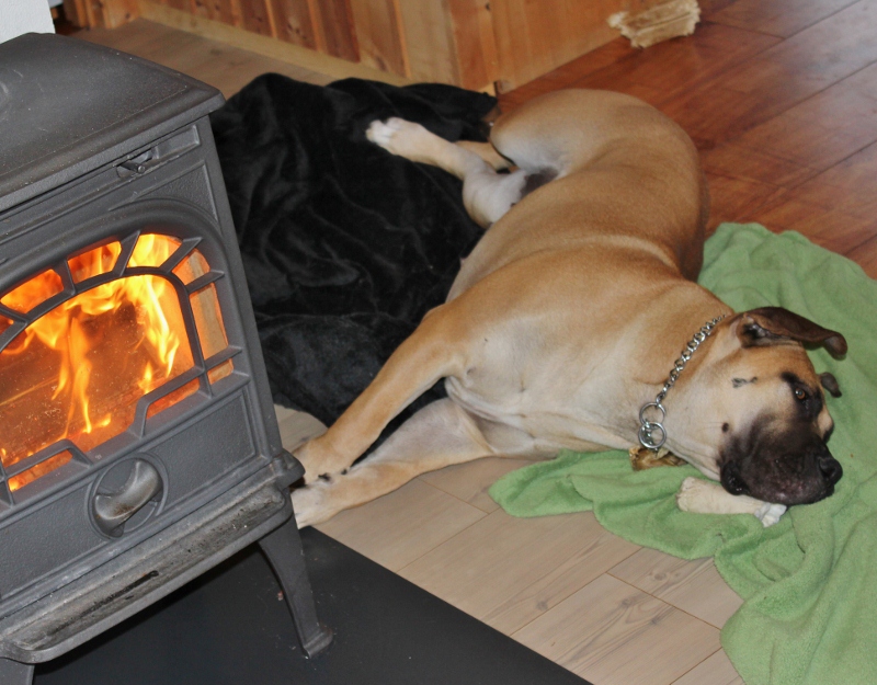 Ene under munnen, andre under halsen, og hun hadde sikkert resten under seg. Men hun koste seg godt ved ovnen, det gjør hun forøvrig ikke i dag, for jeg har enda ikke fått fyr på ovn, etter 6 opptenningsposer.